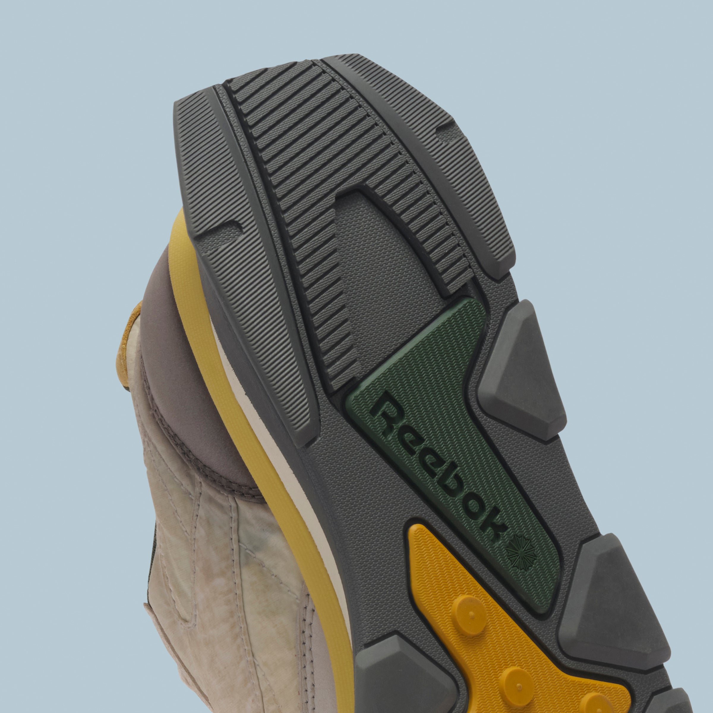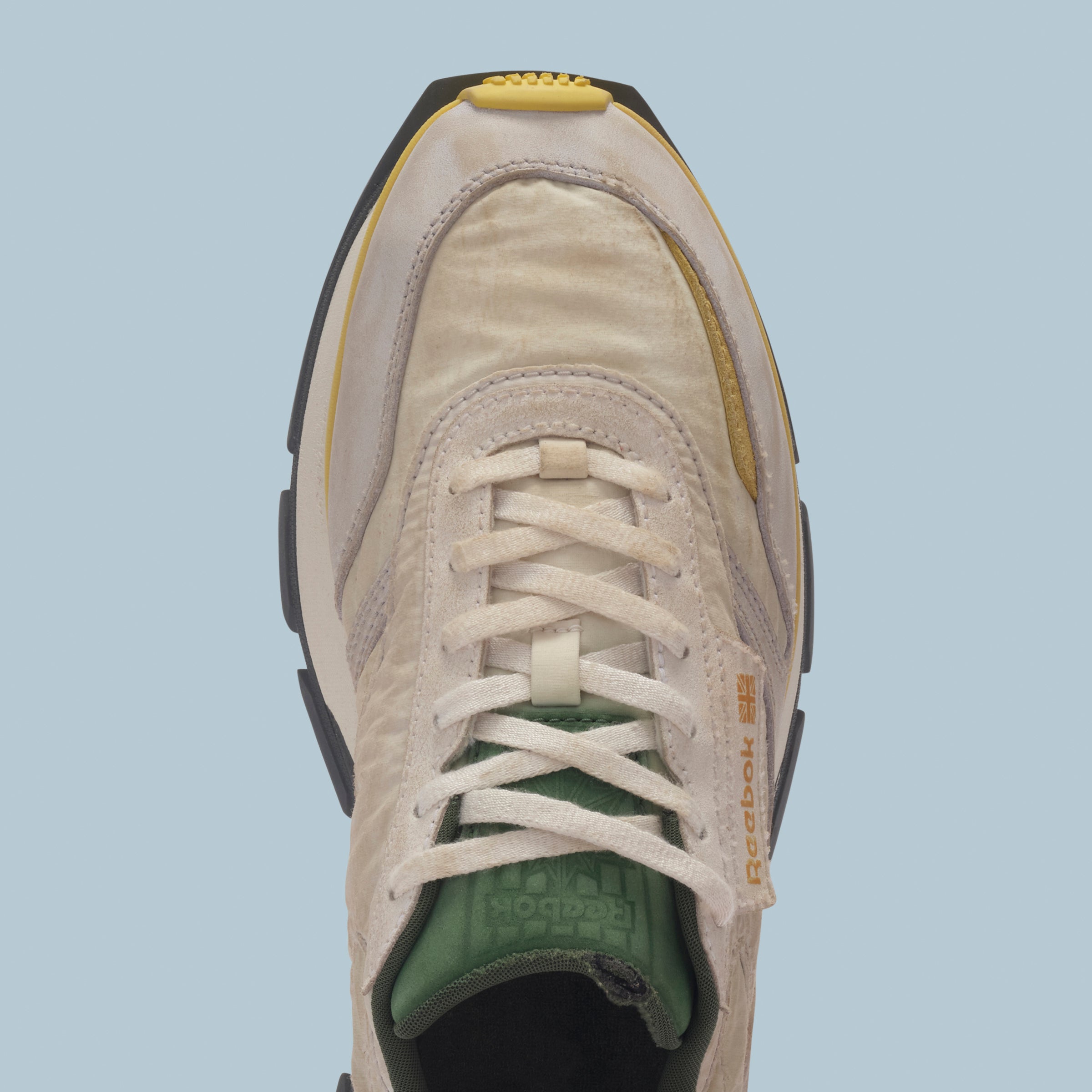 These Reebok shoes reinvent an icon with their vibrantly colored outsole. A leather. suede and textile upper features updated branding. The reinforced toe box remains true to the original low-top model.
