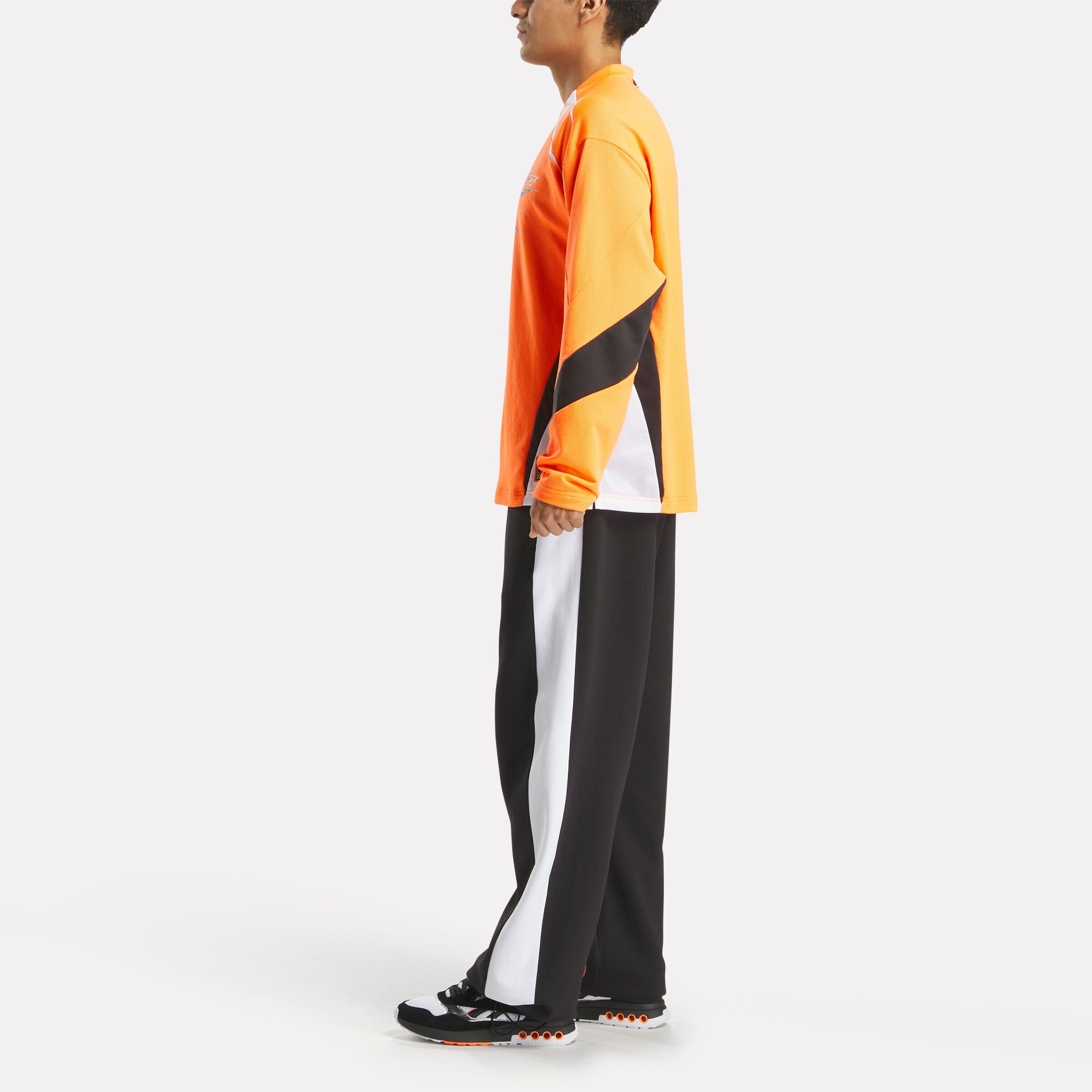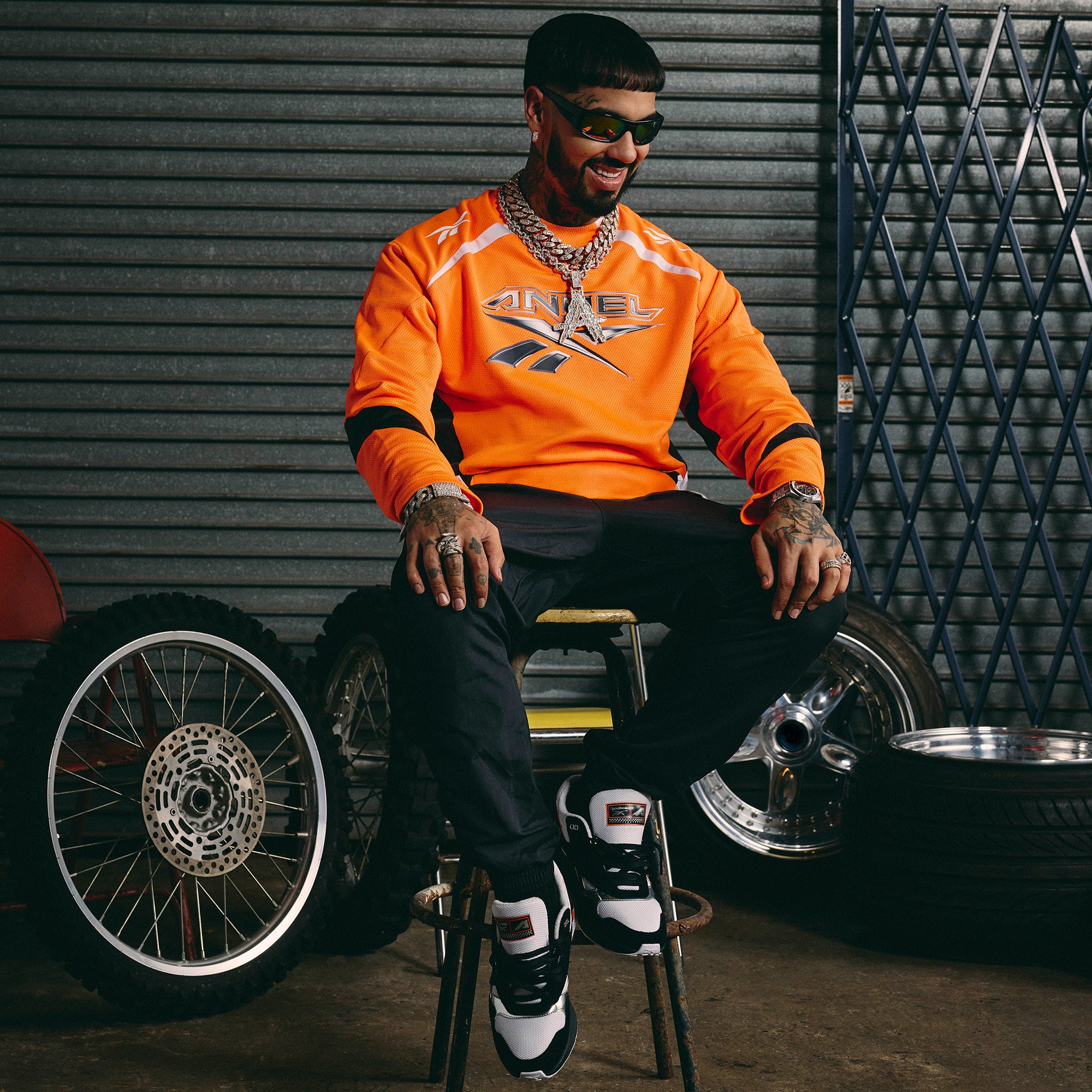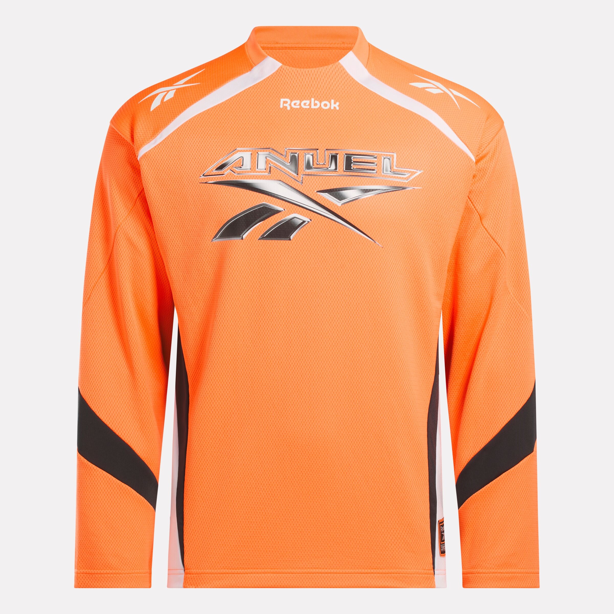 Designed with Anuel AA. this Reebok t-shirt highlights connections to trailblazing athletes and moto sports culture. Drawing inspiration from the gritty reality of street life and the emotional turmoil of heartbreak. the collection embodies a rebellious spirit. It features chrome graphics. metal trim and a custom label.