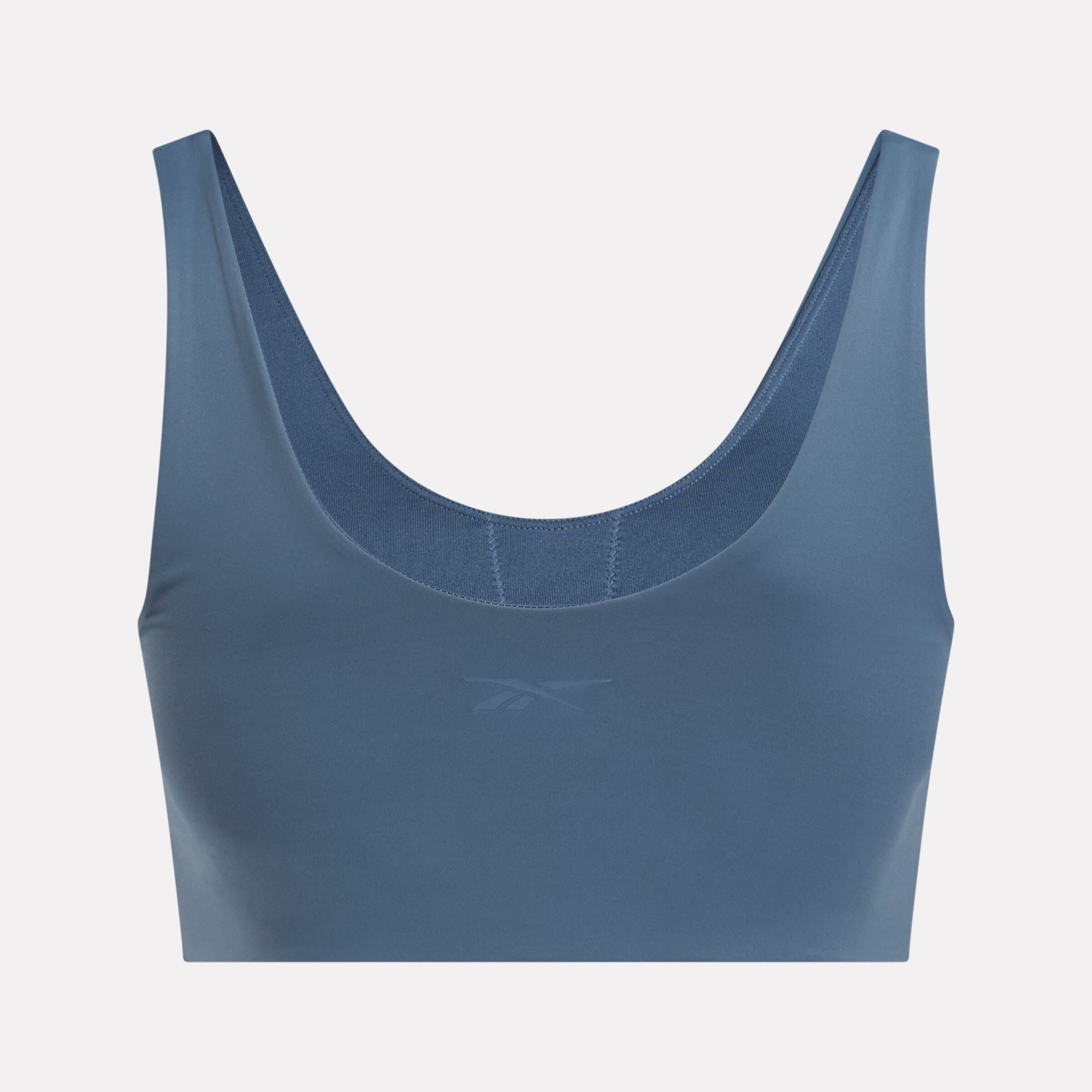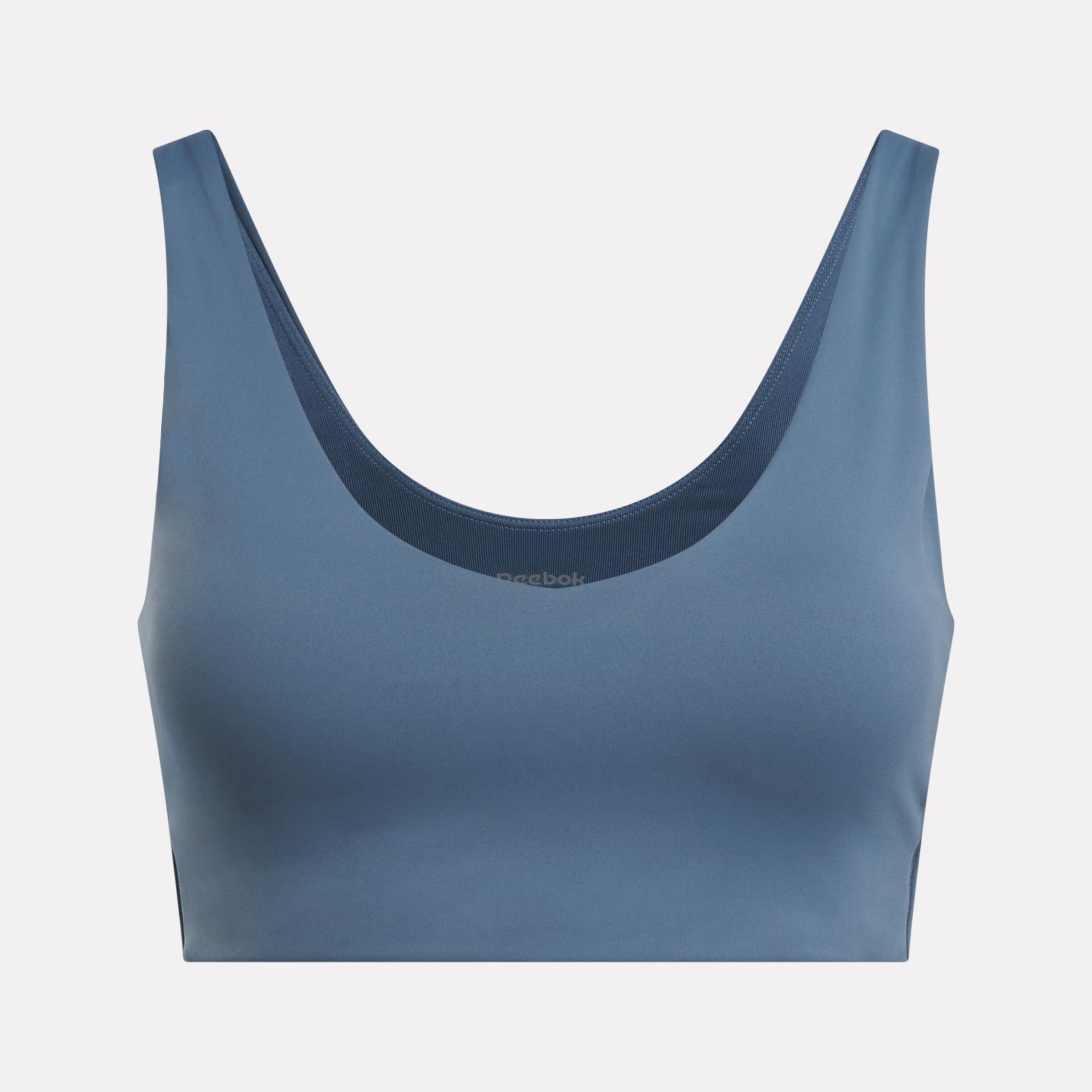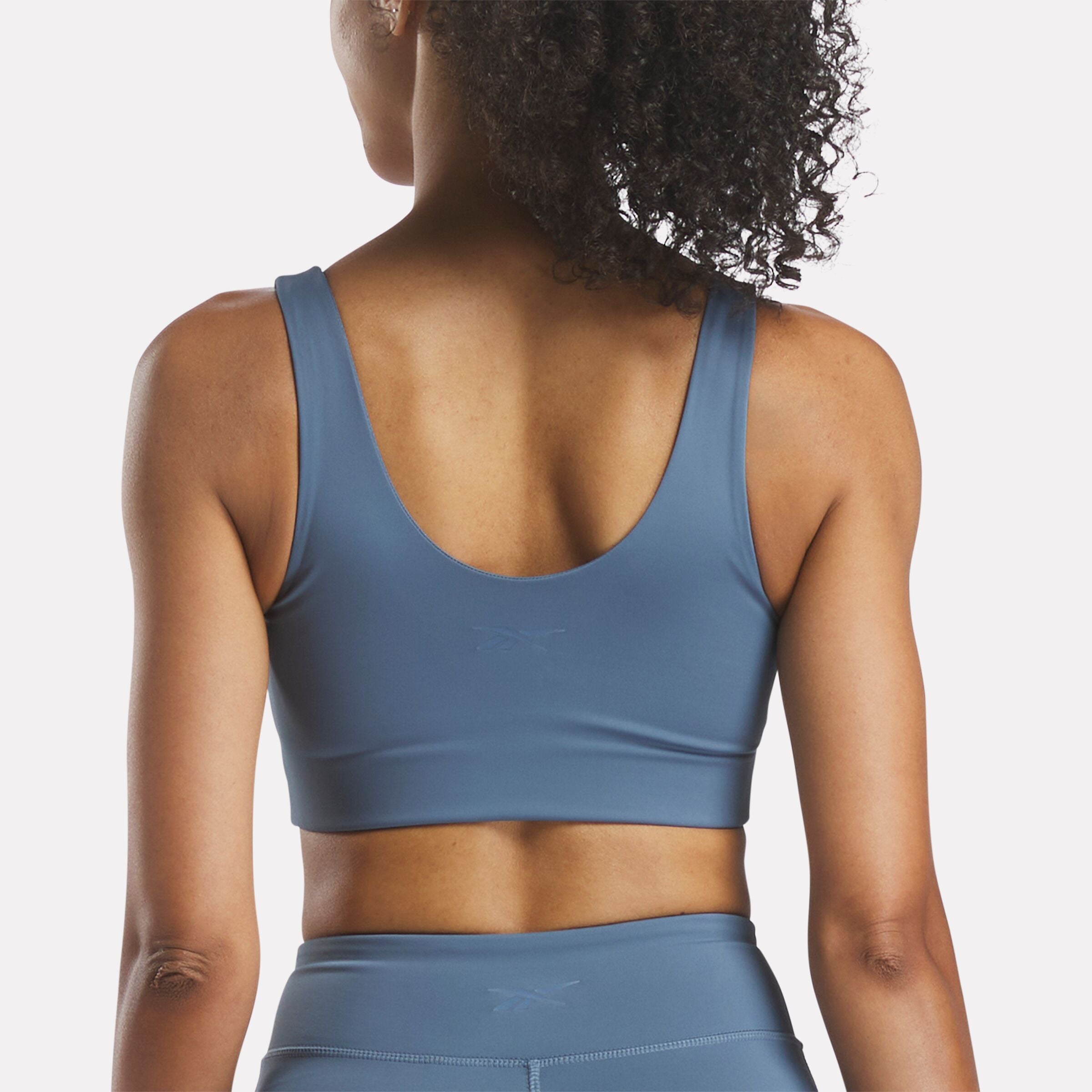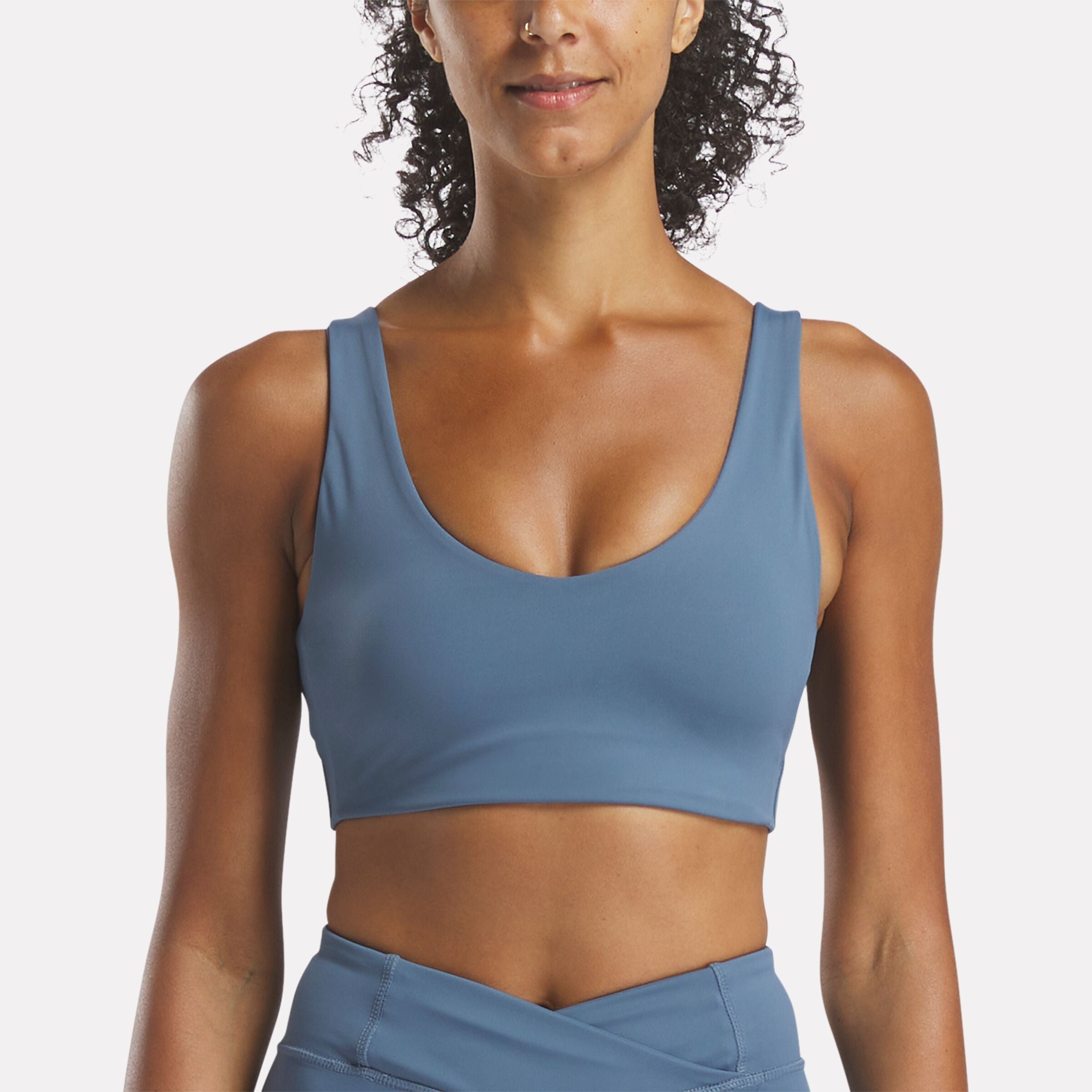 Take on the barre. bike or yoga mat. This women’s Reebok bra offers medium-impact support to help you go all in on your studio workouts. Stretchy. sweat-friendly fabric is cut with a flattering V-neck.